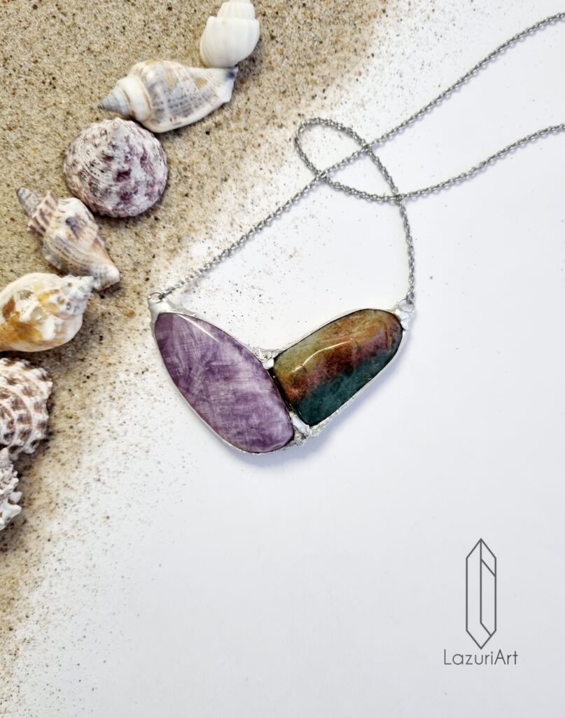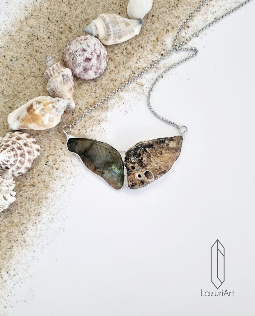 Naszyjnik o długości 70 cm, centralna część o wymiarach 4,0 cm x 3,5 cm wykonana metodą witrażową z miedzi i cyny bezołowiowej. Pozostałe elementy ze stali chirurgicznej.