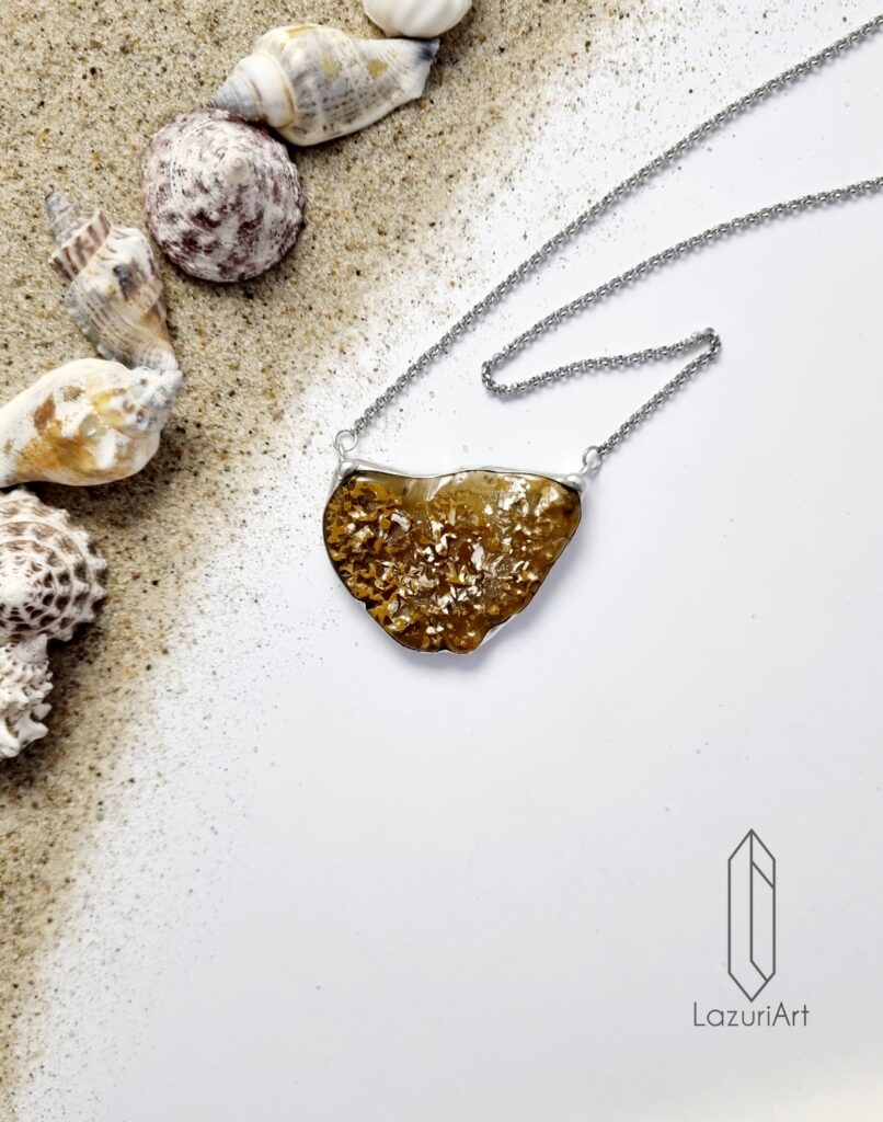 Naszyjnik o długości 42 cm, centralna cześć o wymiarach 3,3 cm x 4,2 cm wykonana metodą witrażową z miedzi i cyny bezołowiowej. Pozostałe elementy ze stali chirurgicznej.