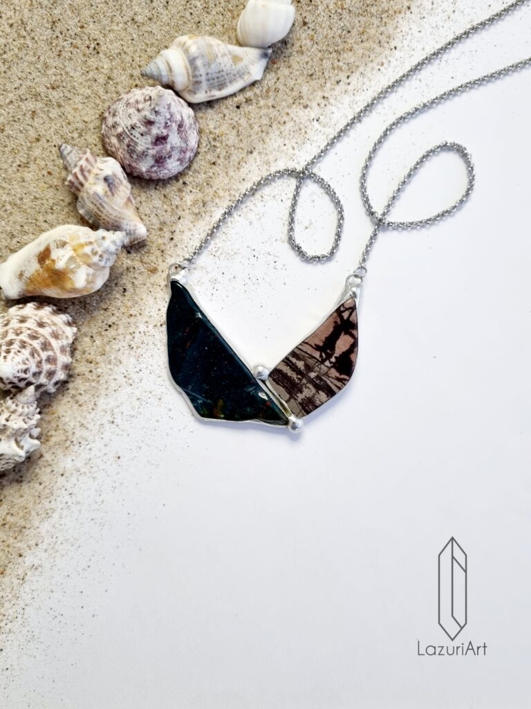 Naszyjnik o długości 55 cm, centralna część o wymiarach 3,6 cm x 2,8 cm wykonana metodą witrażową z miedzi i cyny bezołowiowej. Pozostałe elementy ze stali chirurgicznej.