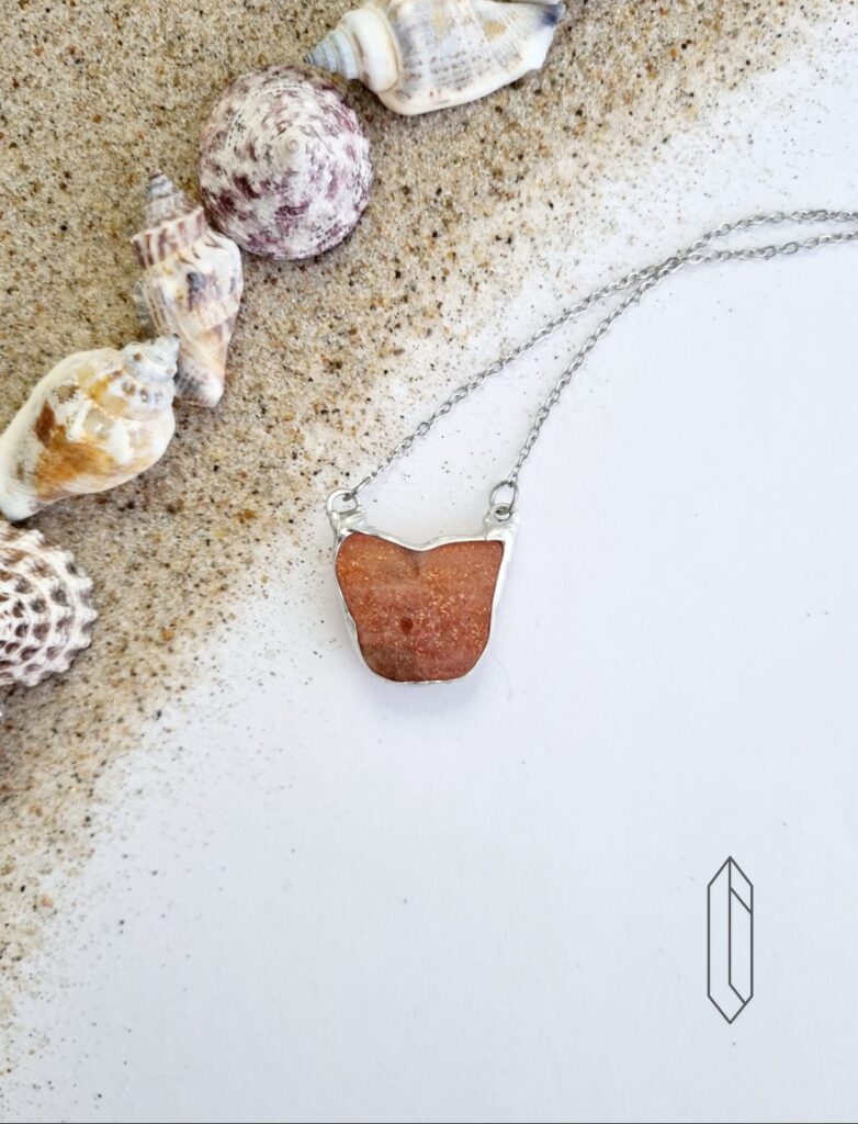 Naszyjnik o długości 50 cm, centralna część o wymiarach 2,3 cm x 2,7 cm wykonana metodą witrażową z miedzi i cyny bezołowiowej. Pozostałe elementy ze stali chirurgicznej.