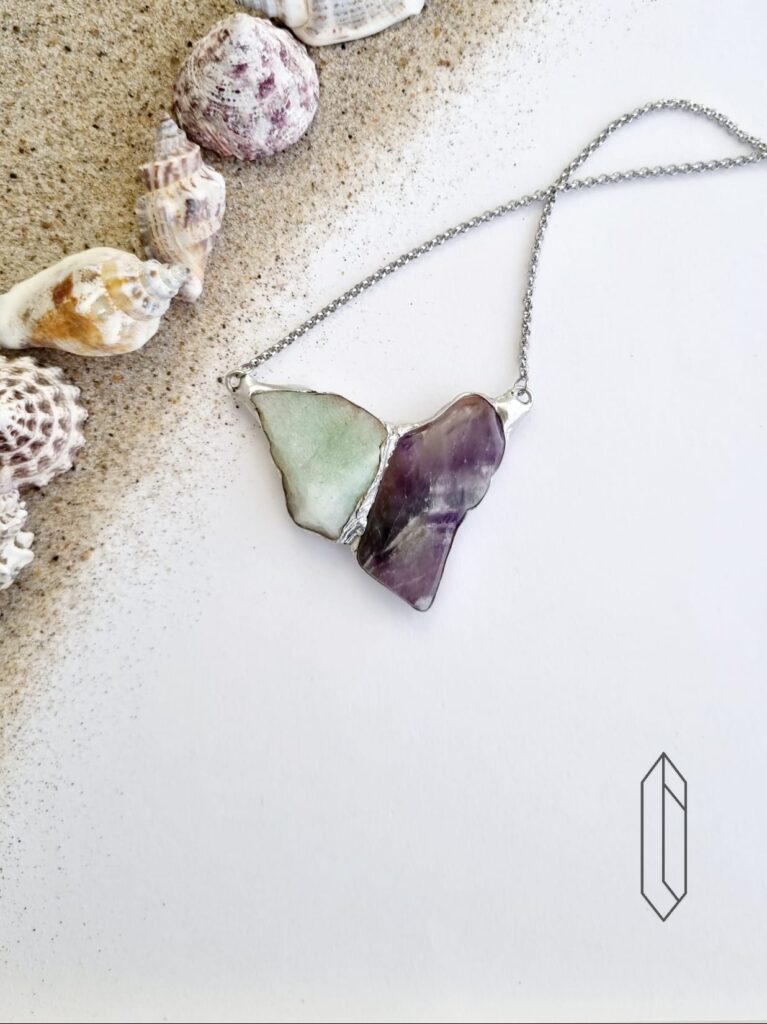 Naszyjnik o długości 40 cm, centralna część o wymiarach 2,4 x 3,7 cm wykonana metodą witrażową z miedzi i cyny bezołowiowej. Pozostałe elementy ze stali chirurgicznej.